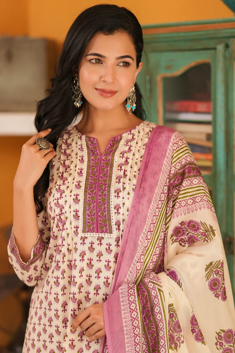 Women Cream Floral Printed Kurta Set with Pink Dupatta | Elegant Ethnic Wear