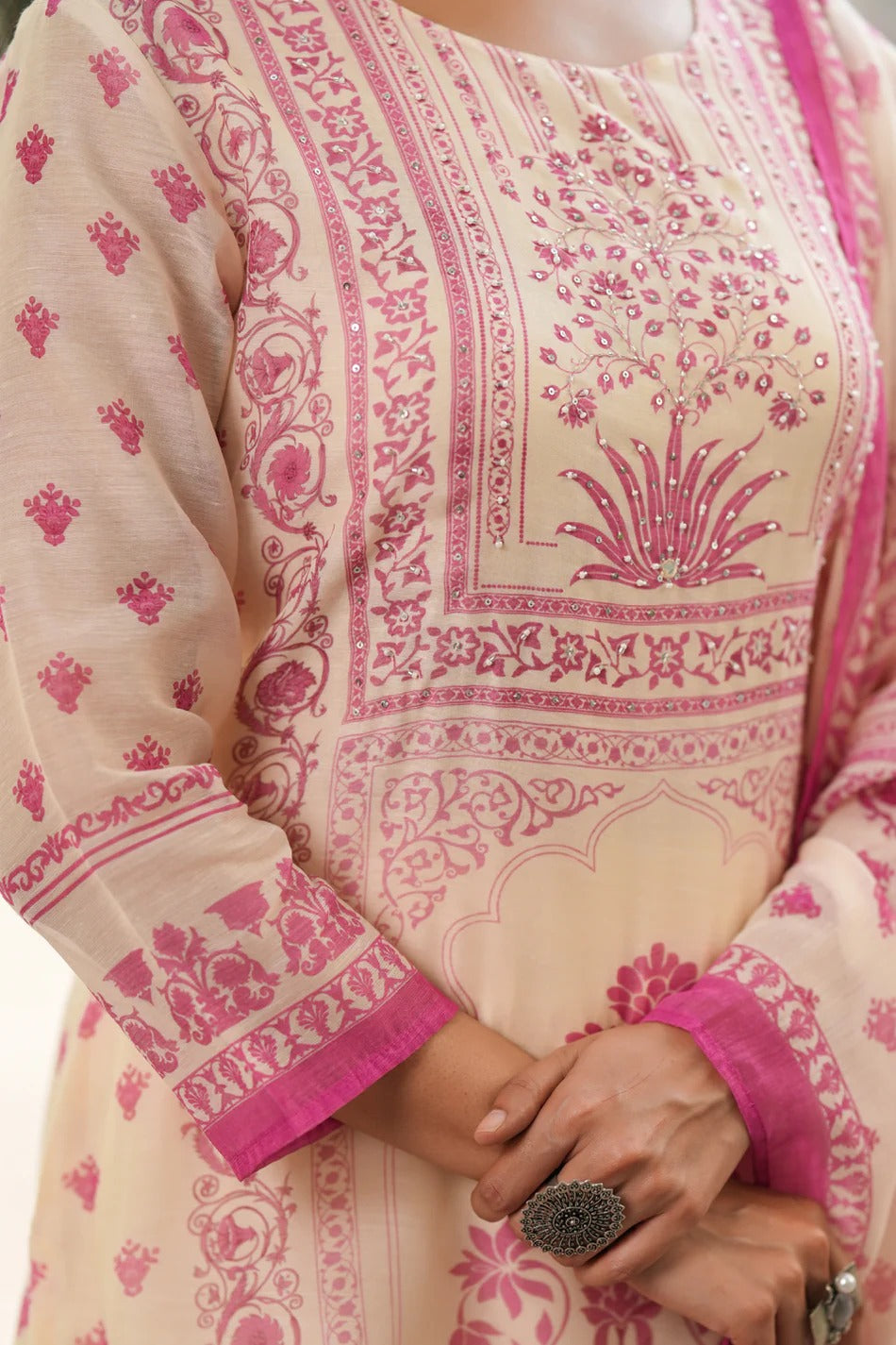 Bring elegance and charm to your ethnic wardrobe with this beautiful cream and pink printed kurta set with dupatta. Designed with delicate traditional motifs and elegant border detailing, this outfit blends classic Indian craftsmanship with modern comfort.