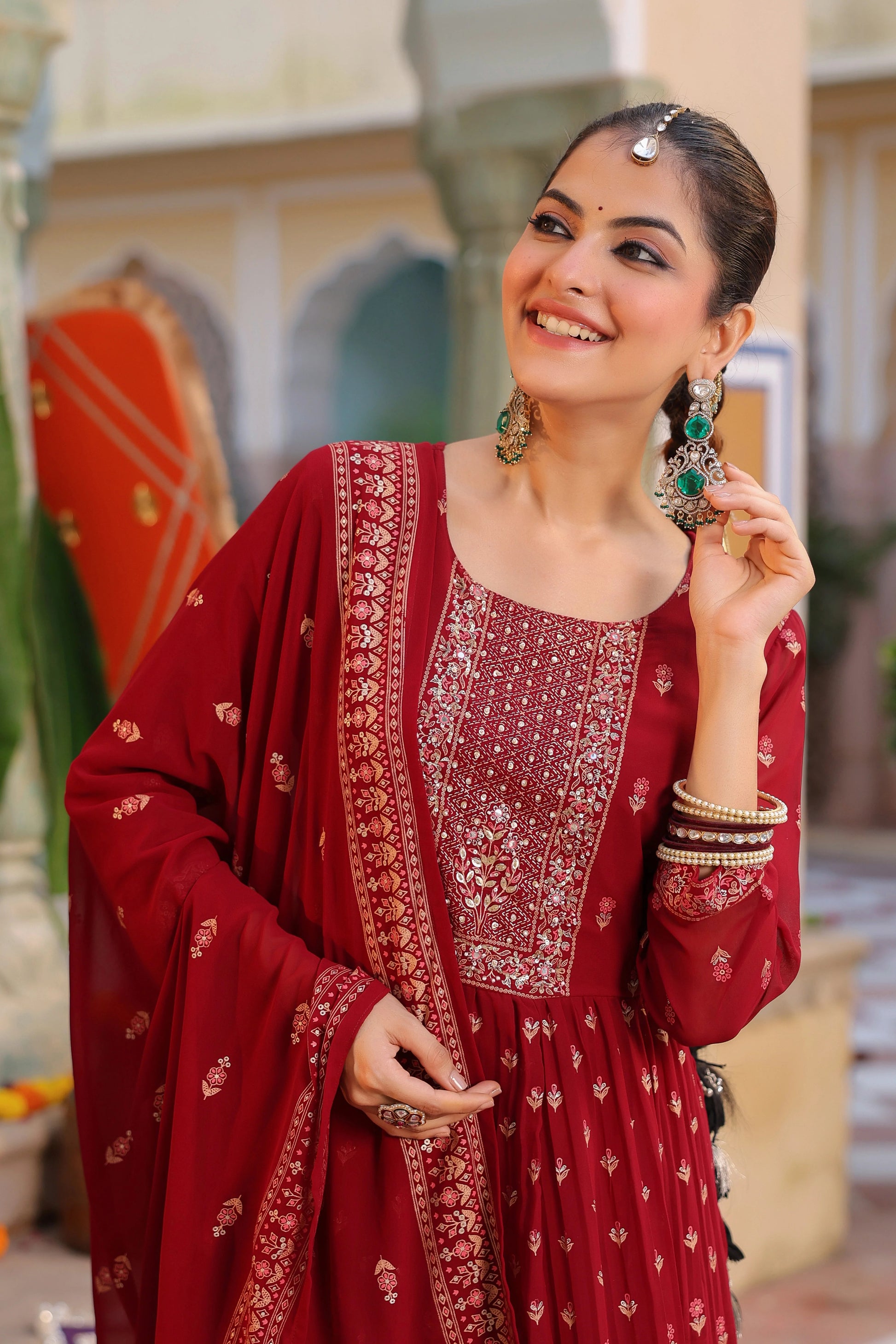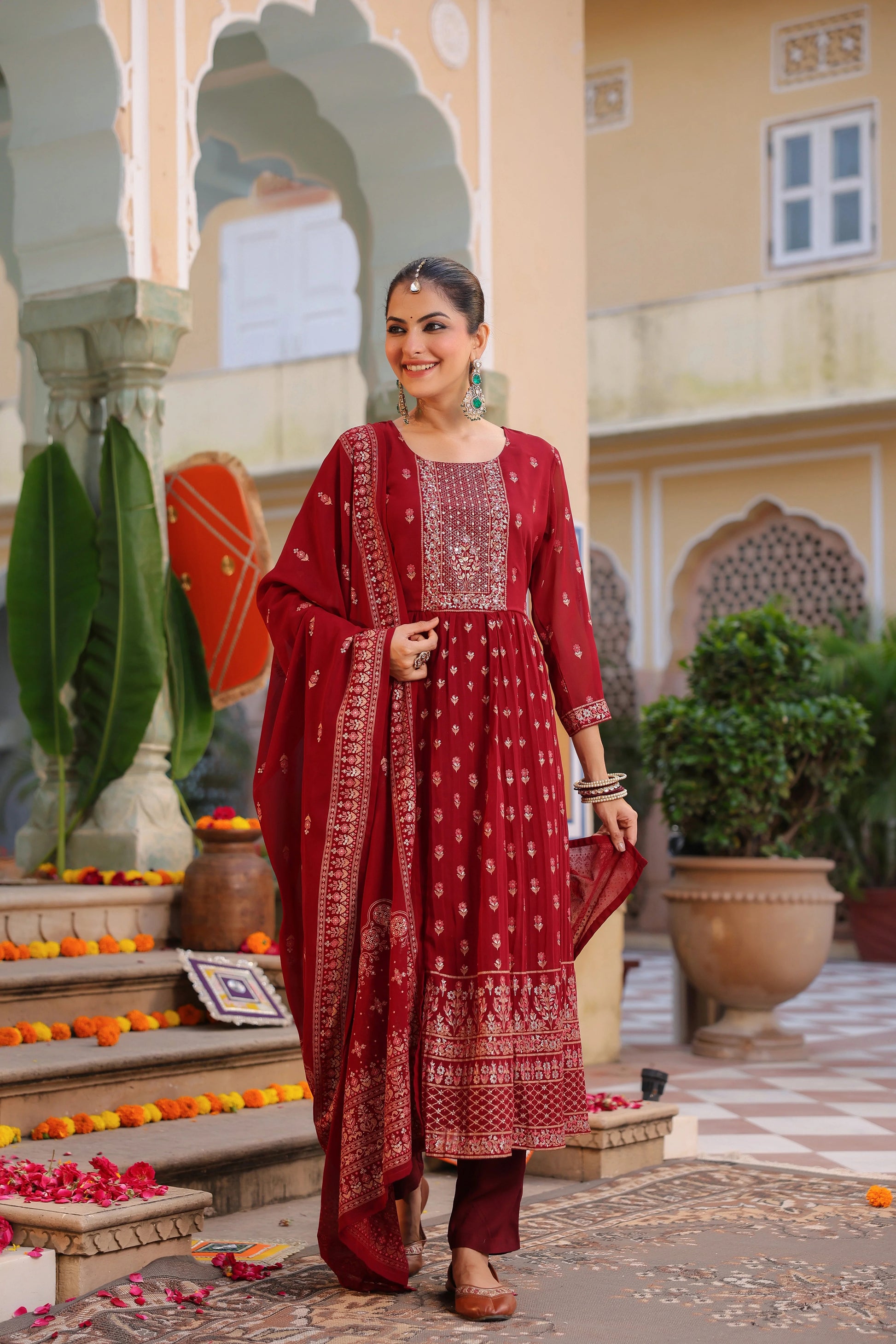 Women Maroon Anarkali Kurta Set with Dupatta | Festive Ethnic Wear