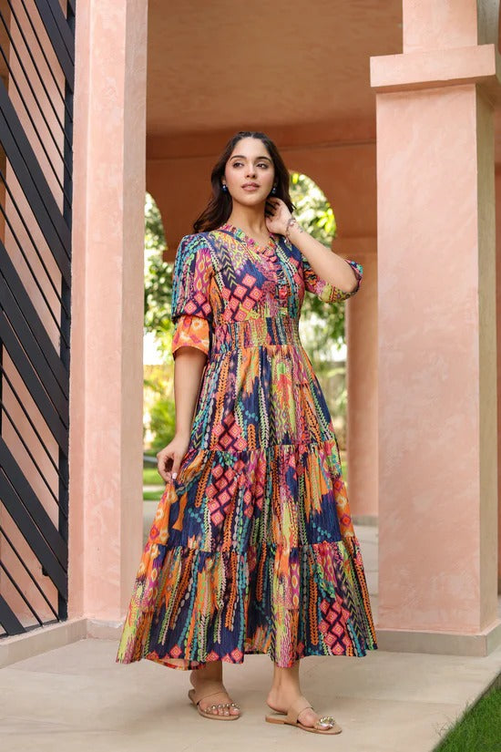 Add vibrant elegance to your wardrobe with this beautiful multicolor printed tiered maxi kurta dress. Designed with artistic geometric and ethnic patterns, this dress blends bohemian fashion with traditional Indian aesthetics.
